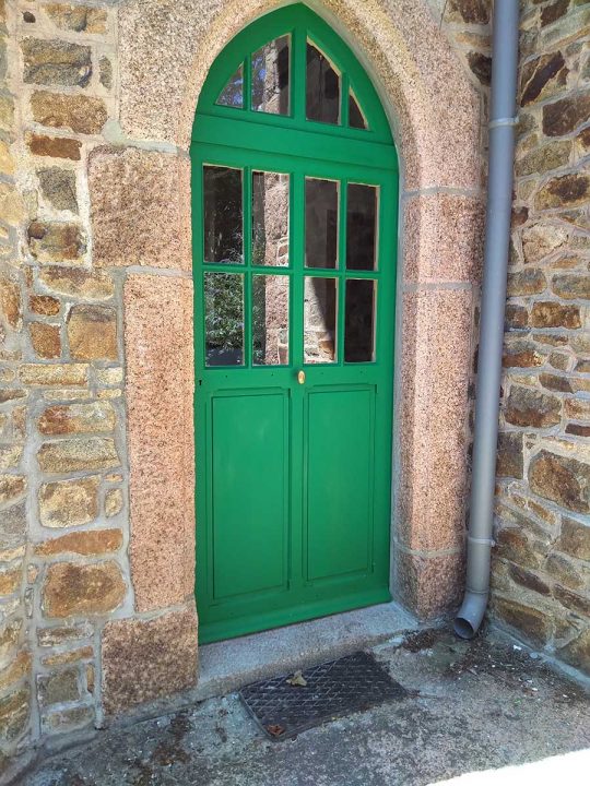 - Fourniture et pose porte d’entrée en chêne massif modèle dito existant, dormant avec seuil carré de 20*20, imposte vitrée en ogive, ouvrant affleurant avec renfort, panneau à table saillante.